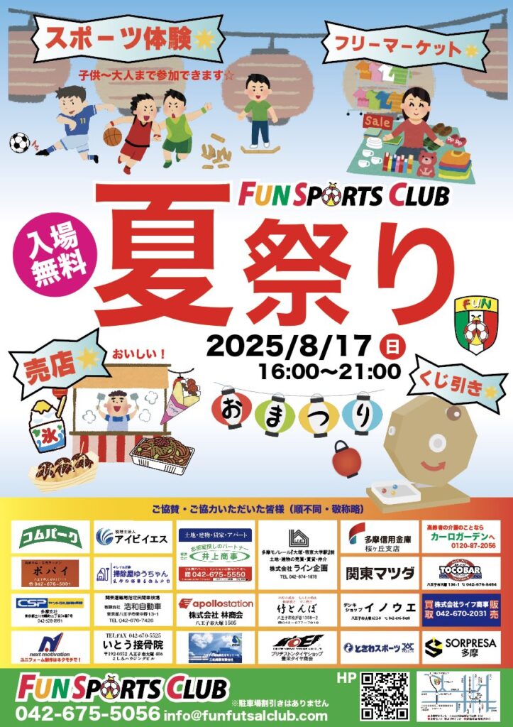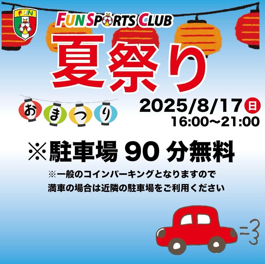 【夏祭り】駐車場情報 2025年8月5日 新着情報 FUN夏祭り2025 【駐車場情報】 夏祭りの8/17(日)ですがフロントにて駐車券90分無料となります。 ※一般のコインパーキングですので満車の場合は近隣の駐車場をご利用ください。 「【フットサル】9/21(日)シニーニャフットサル×FUN 0-30エンジョイMIX大会開催します!」 「【バスケ】9/23(祝火)3on3第一回FUN CUP開催します!」